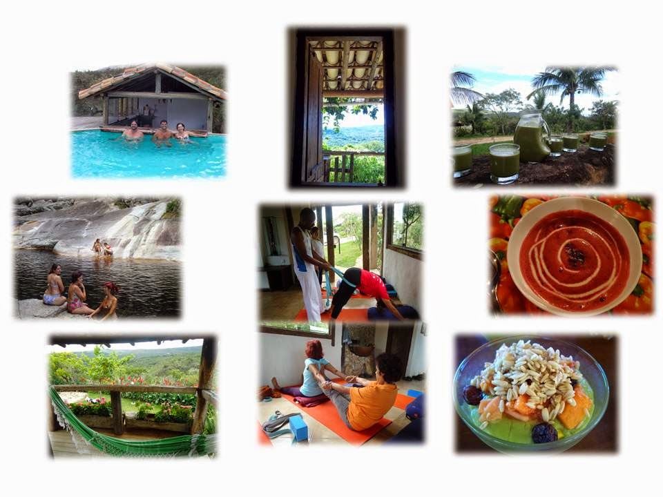 YOGA, ALIMENTO VIVO, CACHOEIRA, ARGILA, PISCINA, SAUNA, CAMINHADA, SUCO VERDE, NATUREZA EXUBERANTE, PAZ, HARMONIA, RELAXAMENTO....