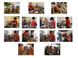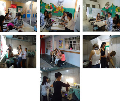 Ex-alunos e alunos da Oficina Germinar espalhados pela creche ajudando na elaboração dos alimentos para a festa.
