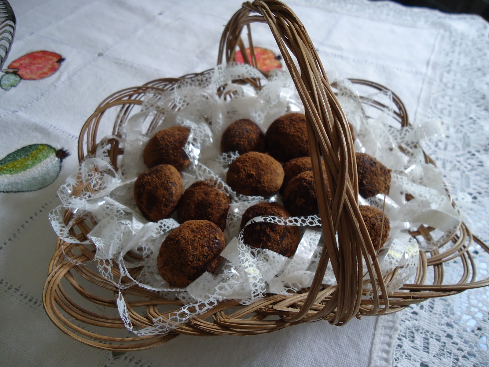 triturar passas pretas com um pouco de tâmaras. ir acrescentando as nozes trituradas com as frutas secas aos poucos, não colocar muitas frutas secas, salpicar alfarroba ( bem pouco, este é o segredo), raspa da casca da laranja., misturar bem e formar as trufas. Passar na farinha de alfarroba de leve.
