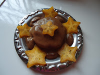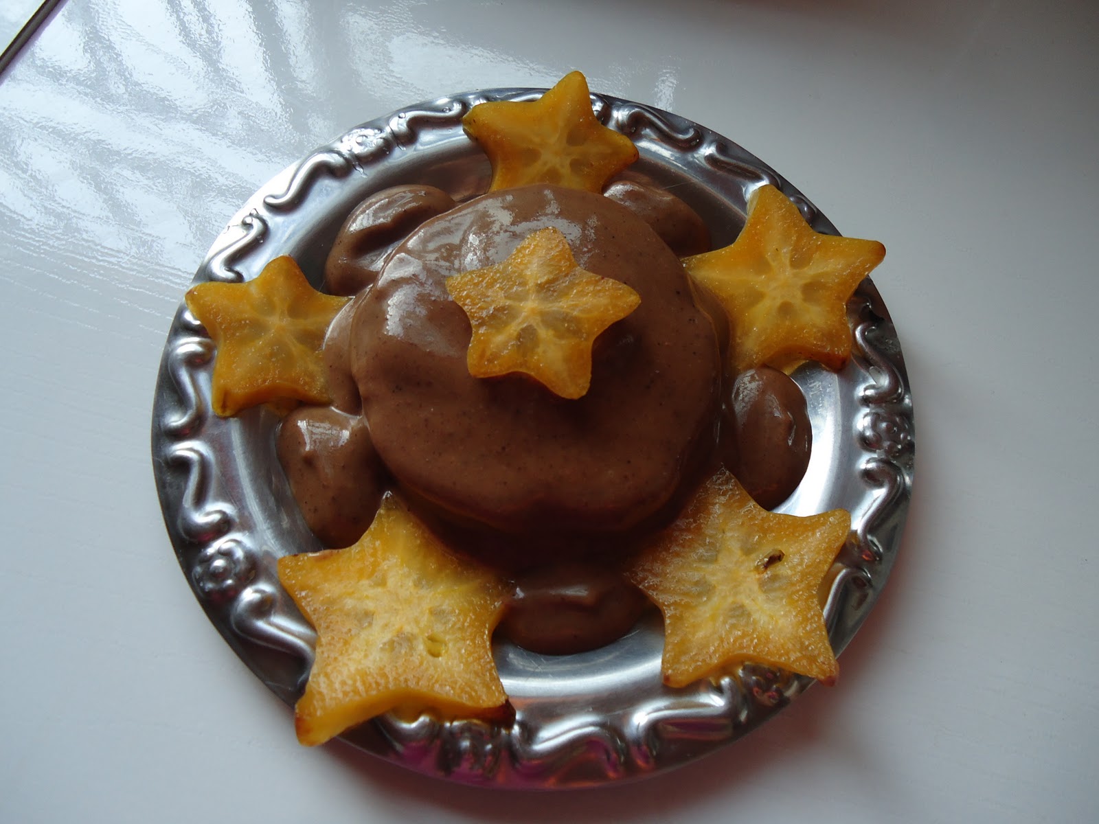 Fatiar uma rodela grossa de abacaxi, jogar por cima um creme de cacau.