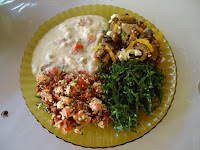 Preparando: Comece amornando as folhas, e aos poucos vai acrescentando a cenoura, o temperinho (sal e ervas se preferir, nada de azeite.) Por último, coloque um pouco do coco ralado. Colocar no prato o amornado e por cima o creme.