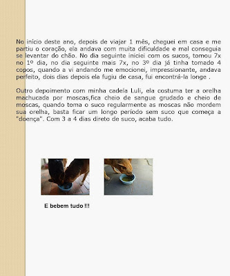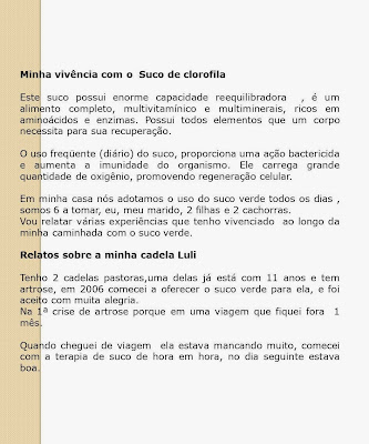 semana passada, deparei com Luli babando muito e bamba das pernas, pensei até que estava querendo partir, foi de uma hora para outra, algumas horas depois, Kira estava babando também. percebi que haviam se intoxicado com um desinfetante forte (usado para desinfetar quando o cão está com cinomose) que minha faxineira passou no chão onde elas ficam e não secou, depois de lavar o chão, ela jogou e deixou para secar naturalmente, elas lamberam muito, Luli principalmente. O veterinário por telefone mandou que eu as levasse para uma clínica, e eu experimentei dar uma dose de 20ml de sumo do capim de trigo. passado algumas horas, a Kira diminuiu a baba, Luli nem tanto. No dia seguinte, dei ao longo do dia mais 3 doses para cada uma, e à noite estavam ótimas, e o que achei fantástico também é que Luli caminhava com as pernas retas, normais, coisa que nunca presenciei com o suco verde.