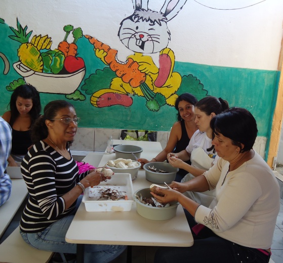 Ex-alunos e alunos da Oficina Germinar espalhados pela creche ajudando na elaboração dos alimentos para a festa.