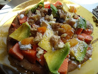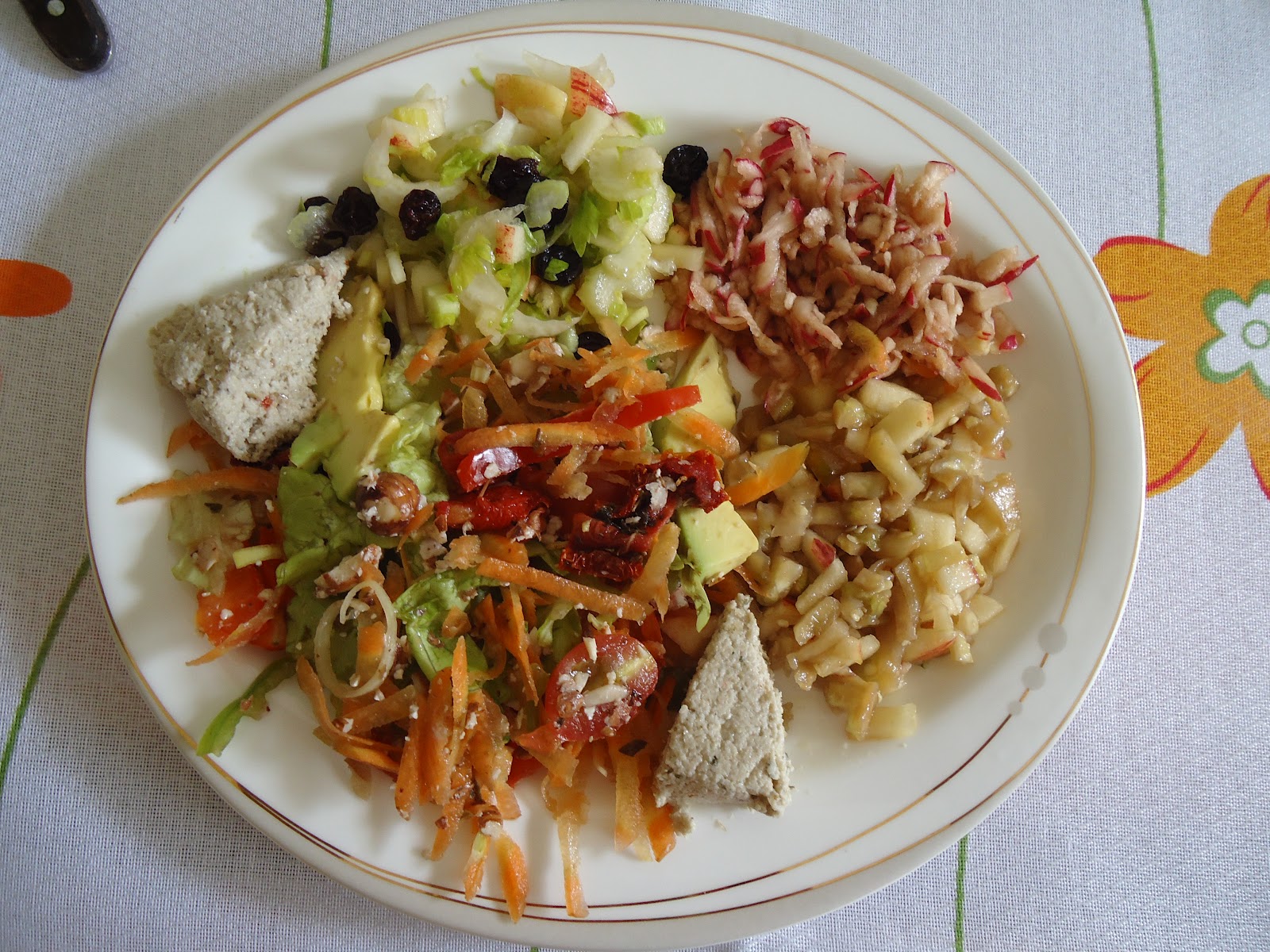 Cenoura ralada, tomate orgânico em meia lua, alface orgânico, bertalha da minha horta, Rodelas de abobrinha bem fina, cogumelo paris fatiado bem fino e marinado no shoyo, limão, azeite e orégano.fatias de manga, crakers em tiras, patê de nozes germinadas.