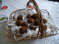 triturar passas pretas com um pouco de tâmaras. ir acrescentando as nozes trituradas com as frutas secas aos poucos, não colocar muitas frutas secas, salpicar alfarroba ( bem pouco, este é o segredo), raspa da casca da laranja., misturar bem e formar as trufas. Passar na farinha de alfarroba de leve.