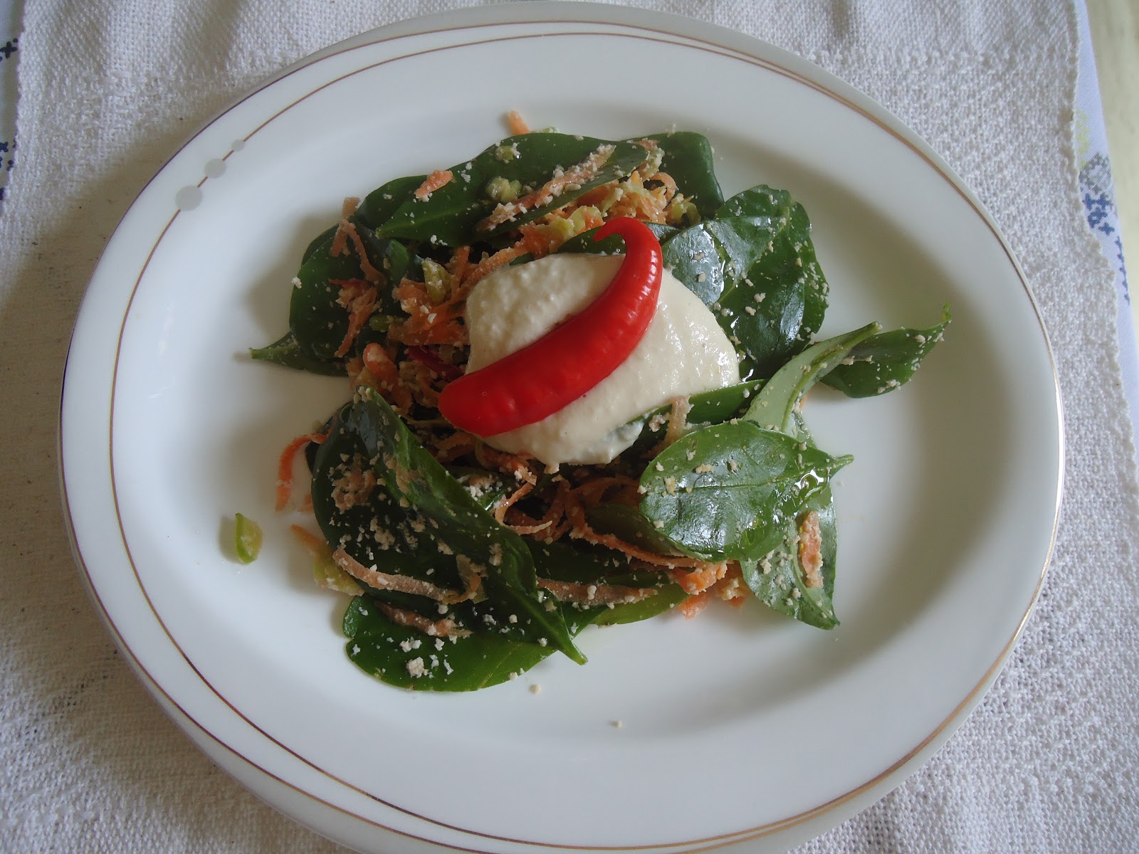 Preparando: Comece amornando as folhas, e aos poucos vai acrescentando a cenoura, o temperinho (sal e ervas se preferir, nada de azeite.) Por último, coloque um pouco do coco ralado. Colocar no prato o amornado e por cima o creme.