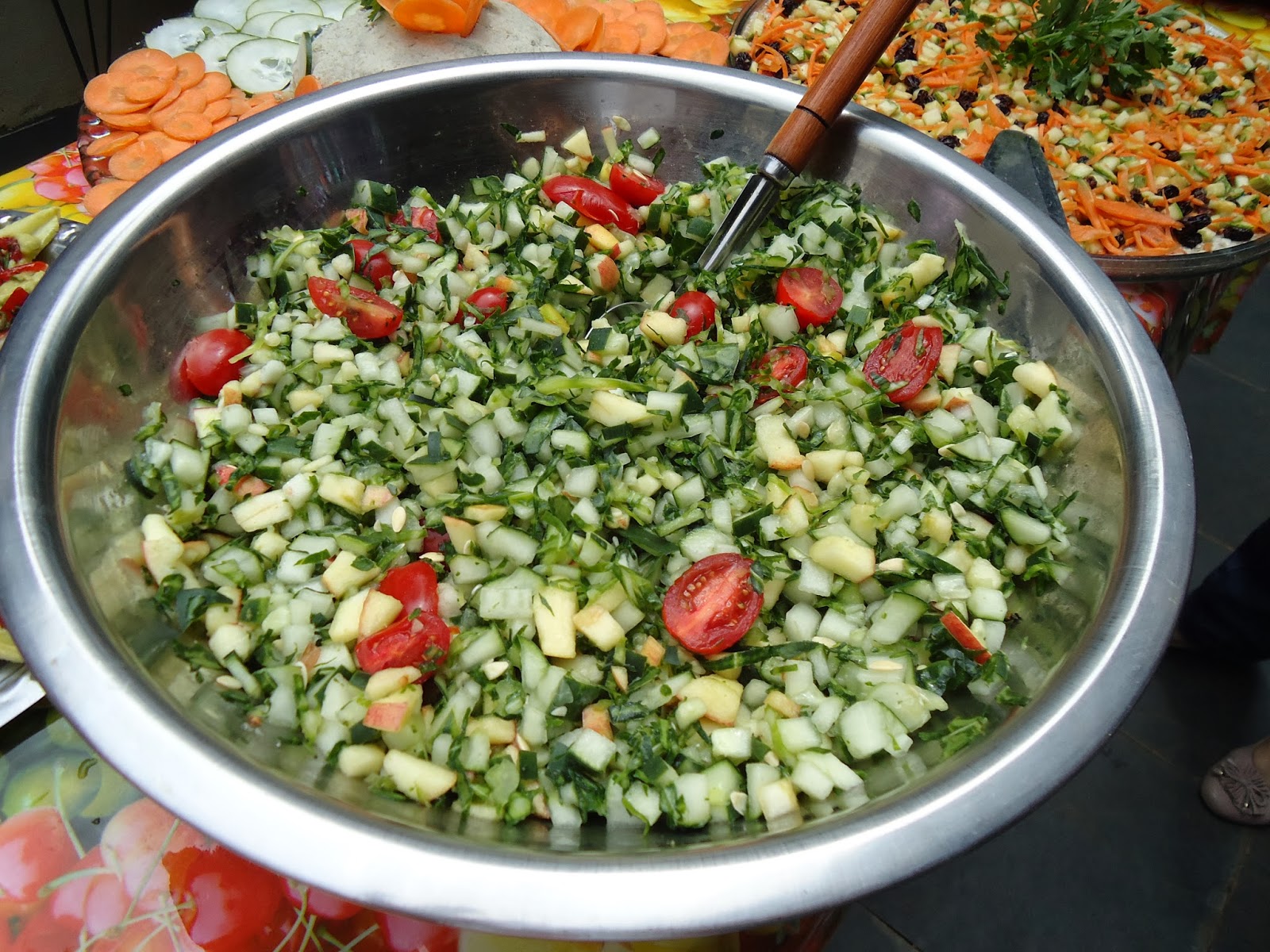 Ingredientes: Couve, mini tomates, maçã e pepino. Picar a couve fininha, salpicar sal e um fio de azeite extra virgem, amaciar com as mãos até que fique amolecida, falamos que cozinhamos com as mãos. Agregar os demais ingredientes picados e temperar com sal e azeite.