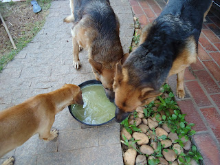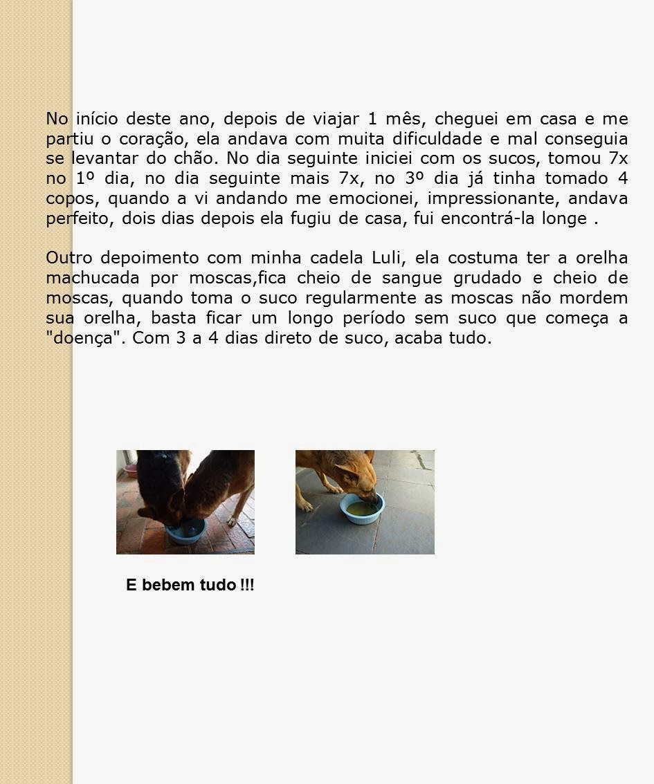 semana passada, deparei com Luli babando muito e bamba das pernas, pensei até que estava querendo partir, foi de uma hora para outra, algumas horas depois, Kira estava babando também. percebi que haviam se intoxicado com um desinfetante forte (usado para desinfetar quando o cão está com cinomose) que minha faxineira passou no chão onde elas ficam e não secou, depois de lavar o chão, ela jogou e deixou para secar naturalmente, elas lamberam muito, Luli principalmente. O veterinário por telefone mandou que eu as levasse para uma clínica, e eu experimentei dar uma dose de 20ml de sumo do capim de trigo. passado algumas horas, a Kira diminuiu a baba, Luli nem tanto. No dia seguinte, dei ao longo do dia mais 3 doses para cada uma, e à noite estavam ótimas, e o que achei fantástico também é que Luli caminhava com as pernas retas, normais, coisa que nunca presenciei com o suco verde.